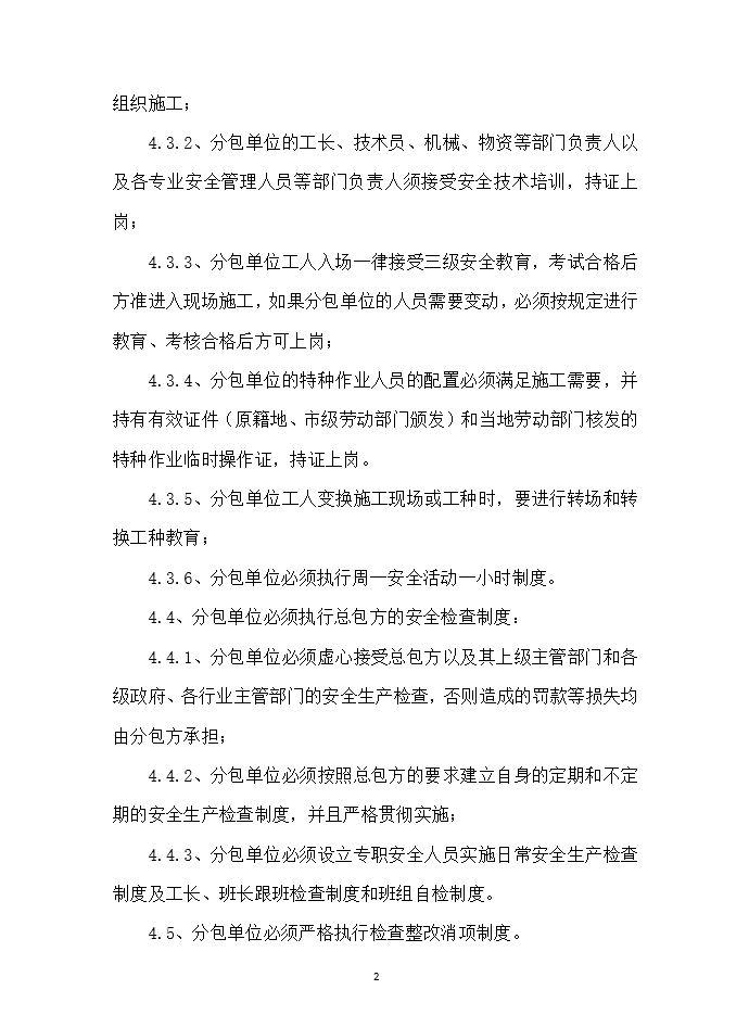 4.3、分包单位必须执行各级安全教育培训以及持证上岗制度;